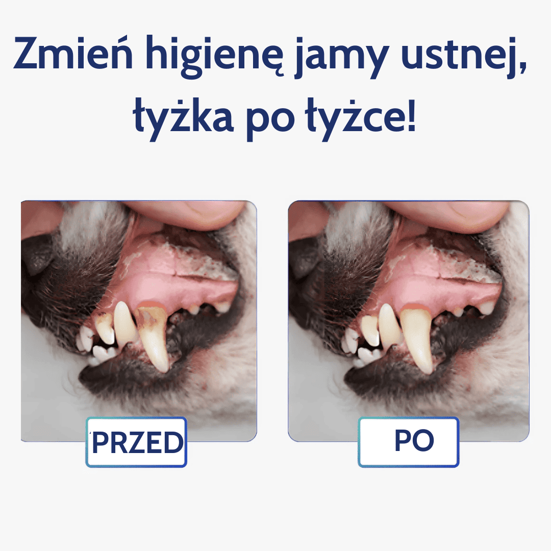 - Kamień nazębny znacznie zredukowany lub nawet usunięty w niektórych miejscach (szczególnie na przedtrzonowcach i siekaczach)